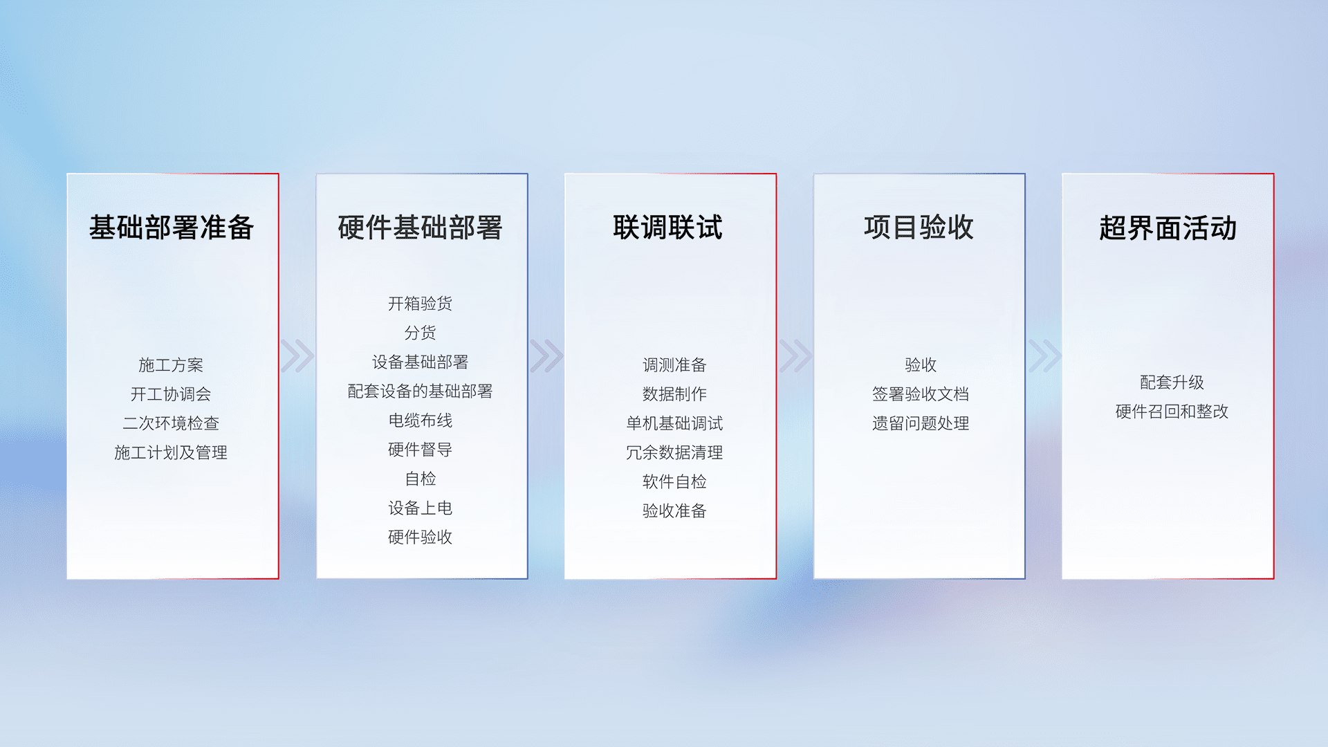 从基础部署准备、、硬件基础部署、、、、联调联试、、、、项目验收、、、、越界面活动的全过程可追溯,,,,保证施工质量和进度。。。